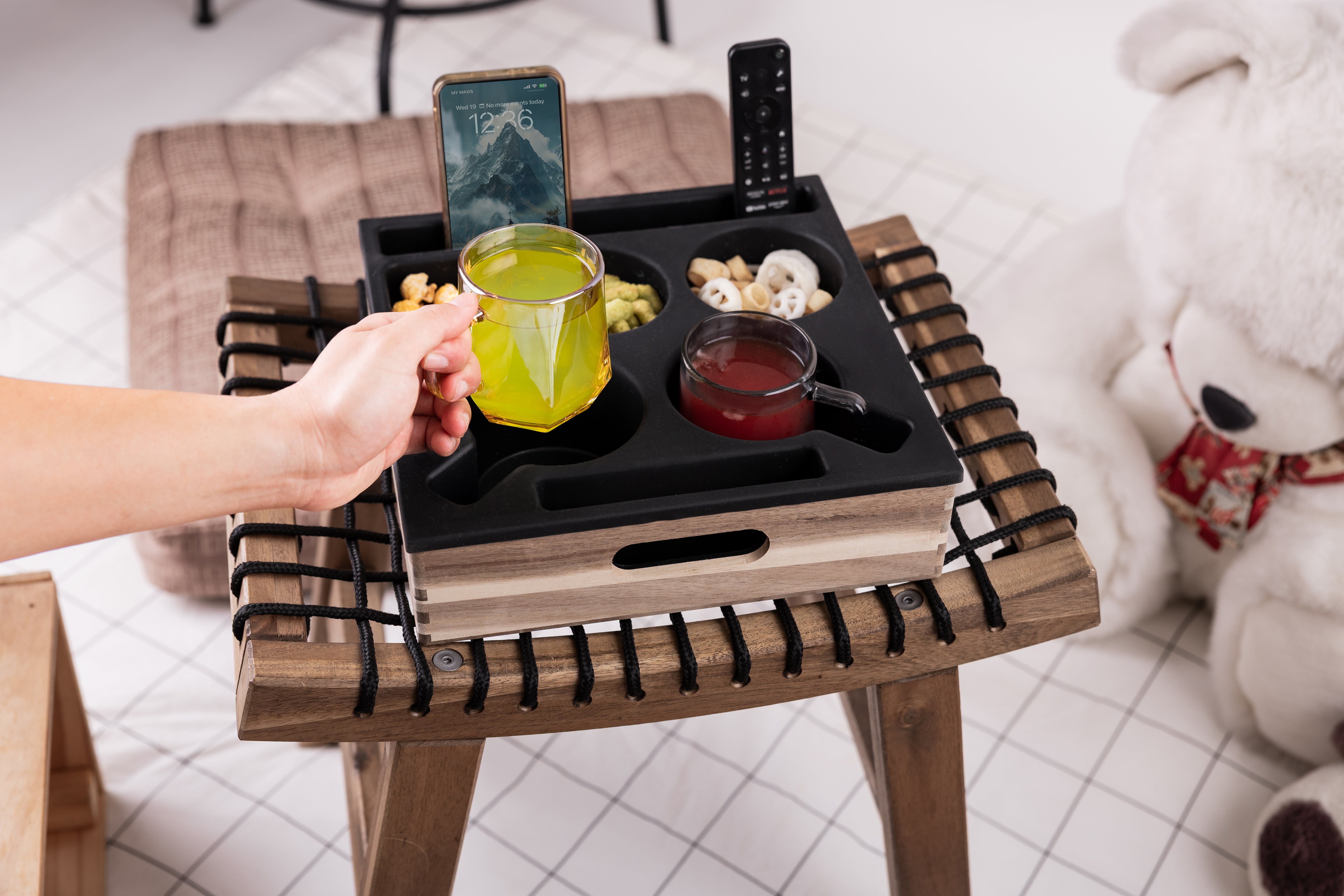 Modern black snack caddy featuring: